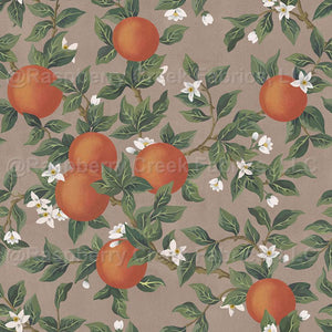 A pretty botanical pattern featuring oranges and blossom in harmonious colour palettes.