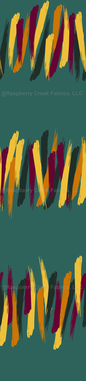 Orange, yellow, burgundy and dark green brush strokes, against an emerald green background.
