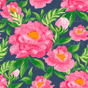 Vibrant pink peonies with lush green leaves on a deep blue background, perfect for fabric and wallpaper, adding a fresh, botanical feel to any space.