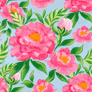 Vibrant pink peonies with lush green leaves on a soft blue background, perfect for fabric and wallpaper, adding a fresh, botanical feel to any space.