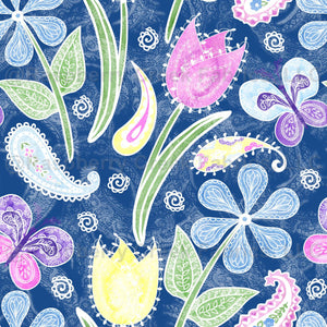 Daisies and Tulips with butterflies made from paisleys, along with more paisleys over light sage green with a lace-like texture. Flower stems are appx. 6" long at default 150 dpi scale. Paisley Flowers Collection.