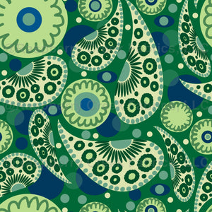 Green paisley and circle motifs on a blue background, multi-directional, for the Paisley Party Ocean Collection.
