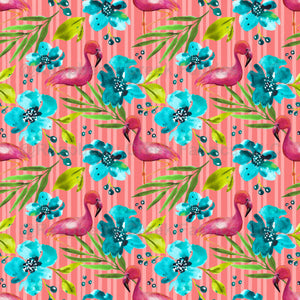 Watercolor bright green Palms, aqua teal Flowers and trademark Palm Springs lawn Flamingo in hot pink and orange on salmon pink vertical stripes. Fabric, home decor, Florida, Island, Tropical. Medium Scale, Hero