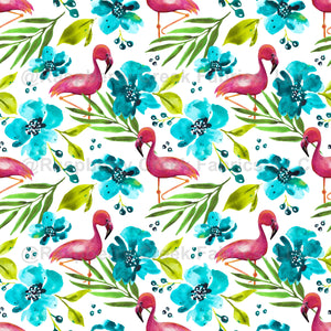 Watercolor bright green Palms, aqua teal Flowers and modern Palm Springs lawn Flamingo in hot pink and orange on white. Fabric, Home Decor, hero for the Palm Springs Lawn and Garden collection. Tropical, island, beach house, swim, Summer