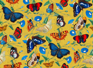Add a sunny and vibrant vibes to your sewing project with Papillonia - Morning Glory with Butterflies in yellow! This eye-catching design features a bold botanical pattern of beautiful blue morning glory blooms and flitting multicolored butterflies. The vivid colors of this striking yet delicate fabric are sure to bring cheer and liveliness to any decor or outfit.