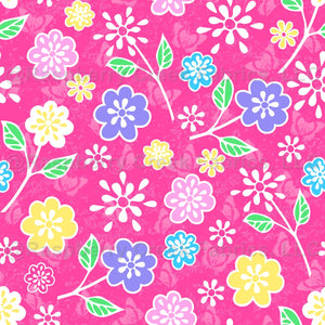 Assorted flowers in bright pastel colors on hot pink with butterfly texture. Largest flowers are appx. 2" across at default 12" repeat, and appx 1" across at 6" repeat (300 dpi).
