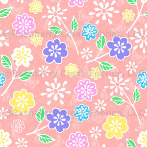 Assorted flowers in bright pastel colors on light coral with butterfly texture. Largest flowers are appx. 2" across at default 12" repeat, and appx 1" across at 6" repeat (300 dpi).