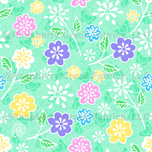 Assorted flowers in bright pastel colors on mint green with butterfly texture. Largest flowers are appx. 2" across at default 12" repeat, and appx 1" across at 6" repeat (300 dpi).