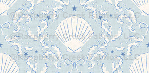This pattern features hand drawn seashells, bows, and seaweed elements on a light blue background, creating a whimsical and delicate underwater theme. The layout is symmetrical and flowing, with a soft, dreamy vibe.