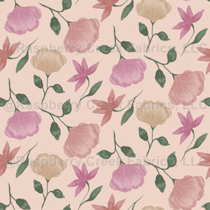 Pastel colors elegant and bold peonies and wildflowers in pink, orange and yellow on a light peach background