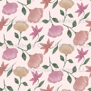 Pastel colors, elegant and bold peonies, and wildflowers in pink, orange, and yellow on a light pink background