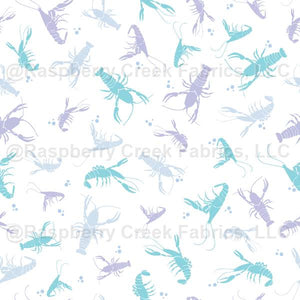 Pastel Lavender, Teal and Blue Gray Freshwater Crayfish Scattered on a White Background.