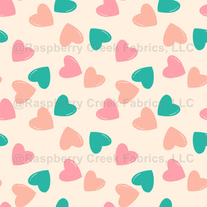 A lively Valentine pattern with multicolor pastel hearts on a cream background. Perfect for Valentine decor, cheerful crafts and kids clothing.