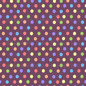 A coordinating Easter pattern design featuring pastel blue, green, orange, pink, purple, and yellow polka dots on a purple background.