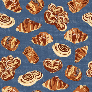 Scattered pastries on a dusty blue linen textured background. It is a part of the Coffee Time Collection.