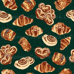 Scattered pastries on a rich forest green linen background.