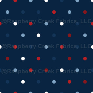 Red White and Blue Polka Dots on Navy Blue design by Cate and Rainn® © Cate and Rainn. All rights reserved. Available in multiple sizes.