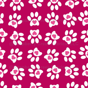 Cute, fun and adorable pattern with white paws with hearts on pink background. Modern and trendy design, perfect for the dog lover.