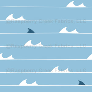This playful fabric design features white stripes intertwined with dynamic waves and shark fins, creating a fun and unique pattern perfect for any project. The combination of vibrant lines and ocean-inspired motifs adds a touch of adventure to your creations, making it ideal for everything from home décor to fashion accessories. Whether you're crafting a beach-themed pillow or a trendy tote bag, this eye-catching design brings energy and style to any design.