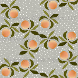 This fabric is printed with sweet little peaches and leaves arranged in loose circular wreath designs with lots of white dots on warm grey.