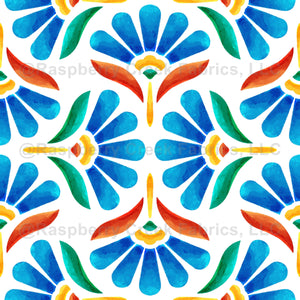 Blue, red and green peacock florals on white background.