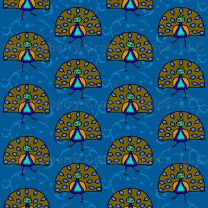 Cute little comic peacocks strut their stuff on a lapis blue background with lighter blue flourishes.