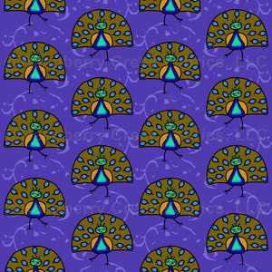 Cute little comic peacocks strut their stuff on a rich purple background with lighter flourishes.