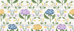 Peony bloom, diamond vine, lilac, blue, yellow, cream