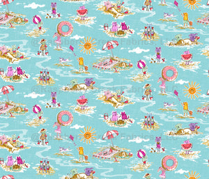 Such a sweet and playful print of dog and cat families at the beach doing all the fun things that I did with my own children when they were young, such as making sand sculptures of our dog, collecting shells, eating ice cream, flying kites, and having a marvelous time