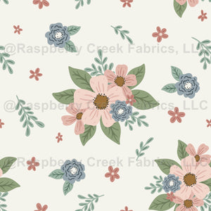 Petals & Posies Floral Bouquets | Scattered floral clusters, Pink and Blue Flowers with green leaves scattered on a cream background