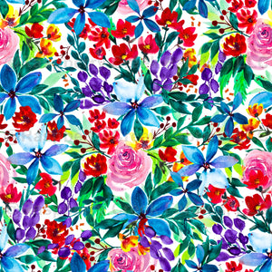 From an original watercolor painting, Phoebe, this brightly color scattered floral is mostly primary jewel tones and primary colors. Red, blue, yellow, green, pink,orange, purple on a white background. Toss layout in a modern floral. Hero of the Phoebe Watercolor Floral Collection