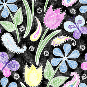 Daisies and Tulips with butterflies made from paisleys, along with more paisleys over black with a lace-like texture. Flower stems are appx. 6" long at default 150 dpi scale. Paisley Flowers Collection.