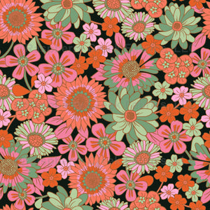 Pink and orange red retro flowers 60's 70's style on black