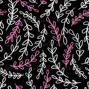 Sweet and scribbly white and pink floral leaves on a black background to pair with the other designs in my Sweetheart collection.