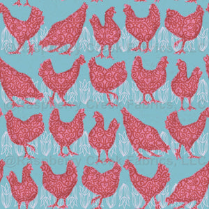 Pink chickens tulips blue for tea towel and kitchen linen.