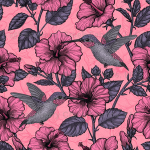Pink hibiscus and hummingbirds, tropical garden on pink