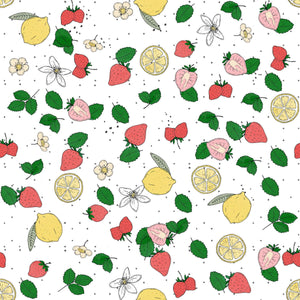 Pink Kelly Green and Yellow Strawberry and Lemon Print Fabric, I Heart Sun by Bri Powell