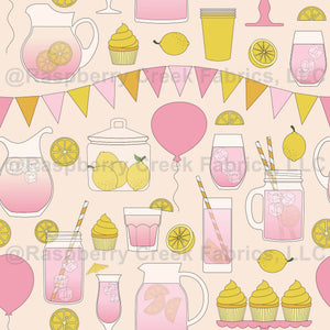 Pink lemonade, lemons, and cupcakes for a cool summer treat.