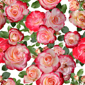 Gorgeous pink and cream ombre Cherry Parfait roses and leaves create a beautiful repeating design on white fabric.