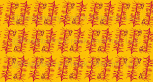 rows of pink orchid leaves and flowers on intense yellow background