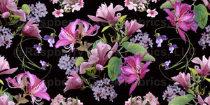 This design features vivid magenta blossoms of the Orchid Tree, the paler mauve blooms of the Tulip Tree, along with delicate sprigs of Indian Hawthorn and more.