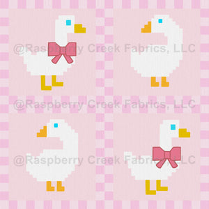 White pixel-art geese with pink bows parade across a soft pink gingham check background in this playful retro-inspired design. The 8-bit style gives it a nostalgic, video-game feel while keeping the palette sweet and modern — blush pink, white, golden yellow feet and beaks, and tiny blue eyes.