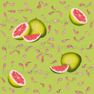 Pomelos are one of the largest citrus fruits in the world, if not the largest. They come in a variety of colors, but they all share large, mild and sweet juicy poppers. This design is created on fresh lime green.