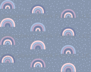 Pink, purple and blue rainbows and dots, against a soft blue background.