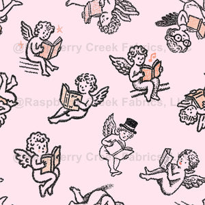 Charming hand-drawn cherubs lounge mid-flight with their noses in books on a soft blush pink background. Each little angel strikes a different reading pose — one sports a top hat, others trail tiny stars and music notes. The stippled ink illustration style gives the design a vintage, engraved feel, with peach and black details against the pale pink ground.