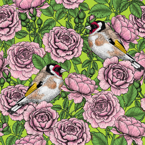 Hand drawn vector pattern with rose flowers and goldfinch birds. All elements for the pattern are drawn first with ink on paper then redrawn and colored in Illustrator.