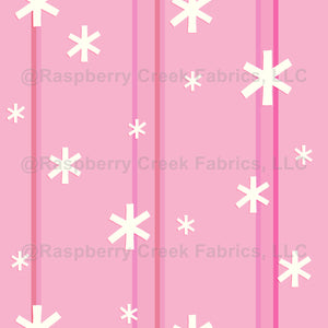 A sweet and cheerful winter design featuring soft cream snowflakes and playful pink stripes on a pastel pink background. Perfect for Christmas pajamas, holiday décor, wrapping paper, and cozy seasonal sewing projects with a fun, feminine touch.