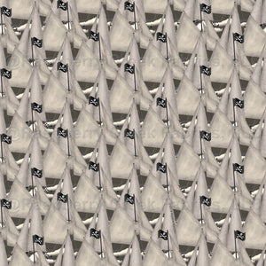Sailing ships in beige and charcoal hoist the Jolly Roger with a twist: those are T-rex skulls.