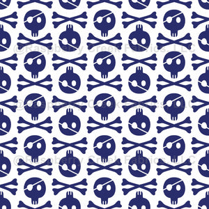 Classic navy blue pirate skulls with crossbones on a white background. Kid-friendly Halloween design.