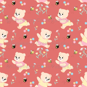 Cute bears chasing buzzing bees in a colourful spring garden on a terra cotta background . Perfect for kidswear, nursery decor and walls.